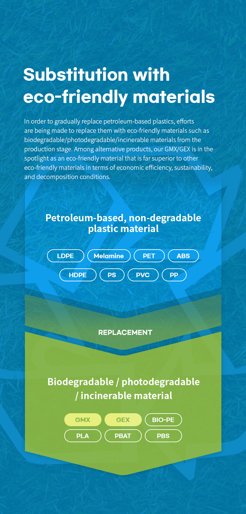 In order to gradually replace petroleum-based plastics, efforts are being made to replace them with eco-friendly materials such as biodegradable/photodegradable/incinerable materials from the production stage. Among alternative products, our GMX/GEX is in the spotlight as an eco-friendly material that is far superior to other eco-friendly materials in terms of economic efficiency, sustainability, and decomposition conditions